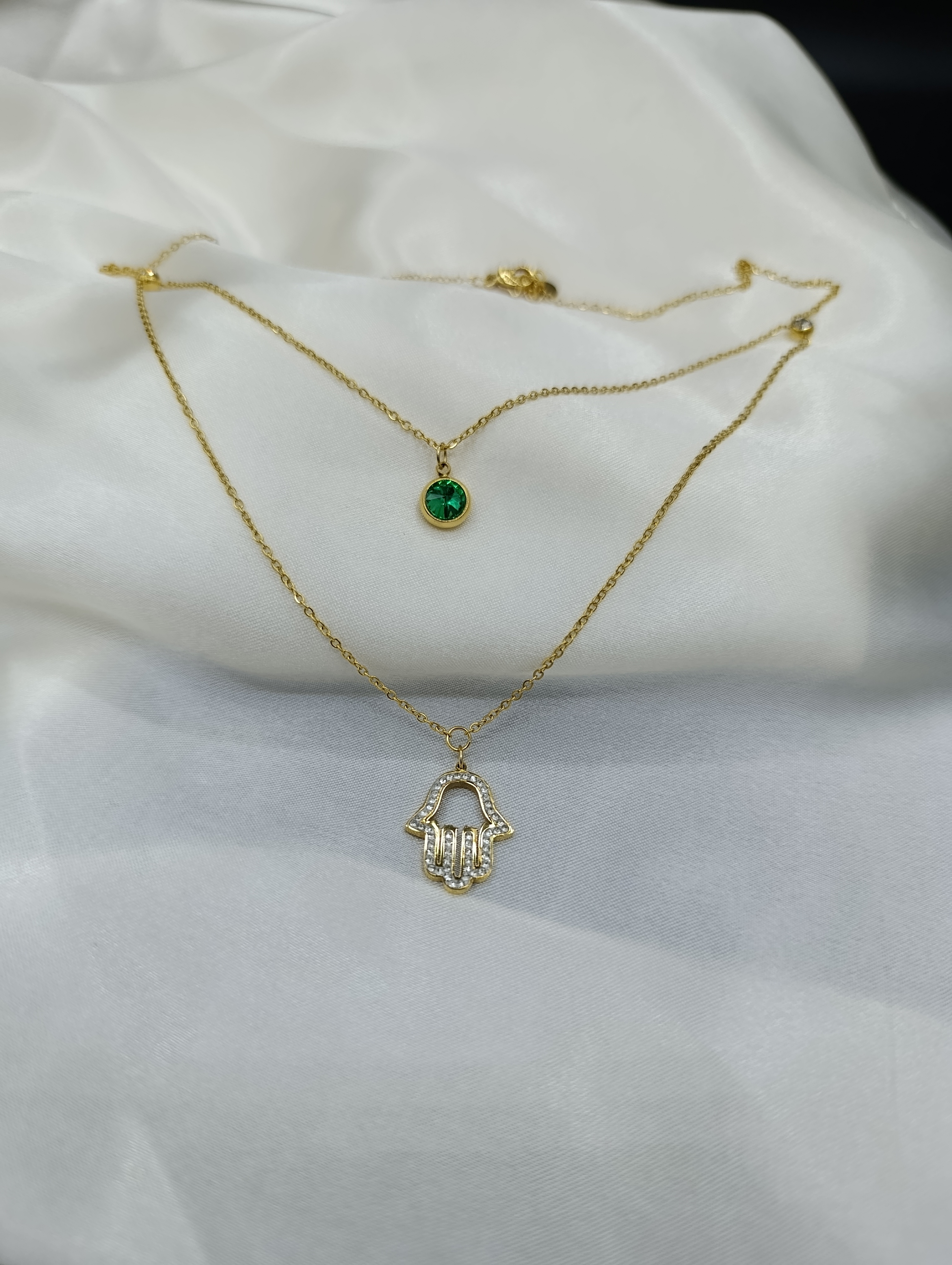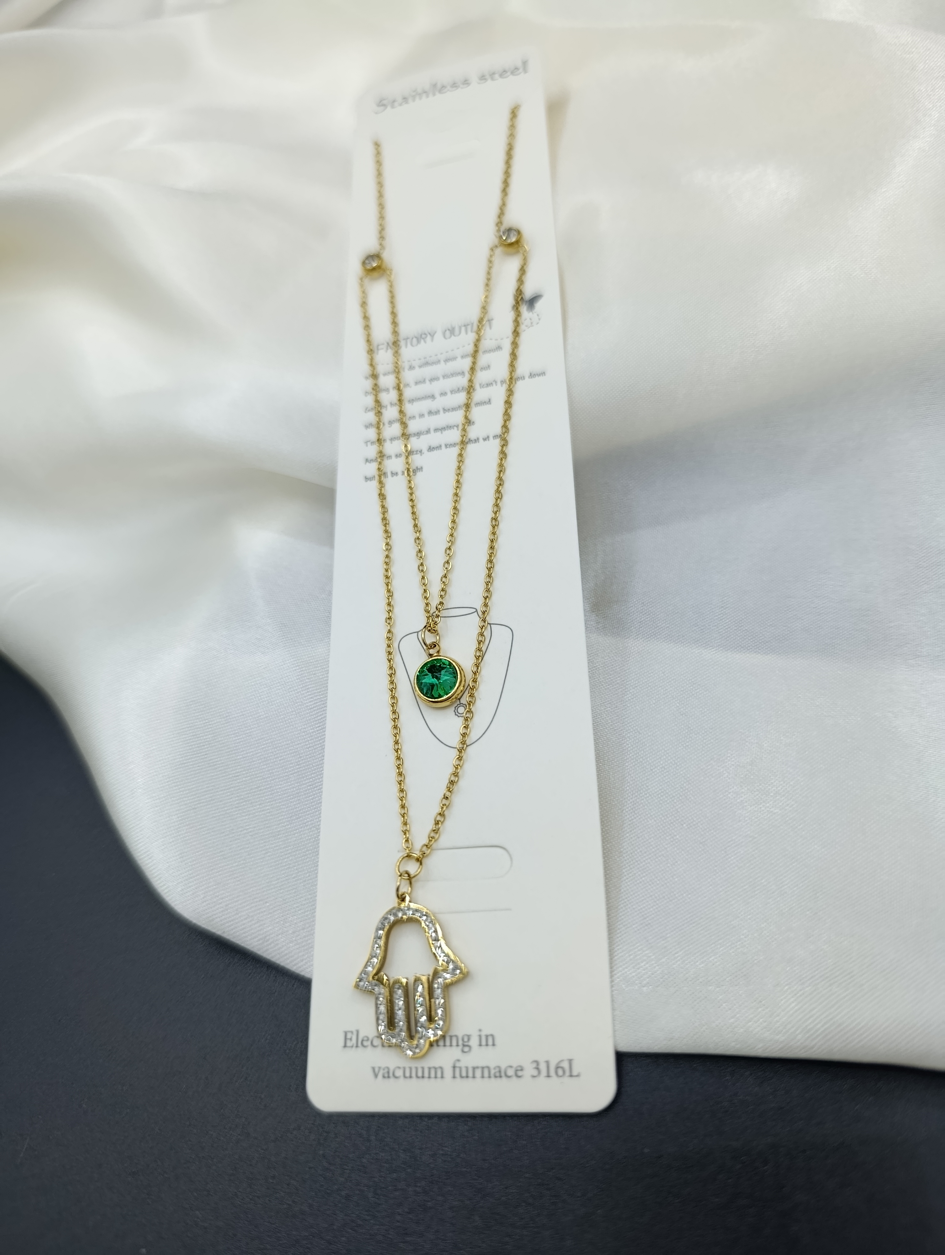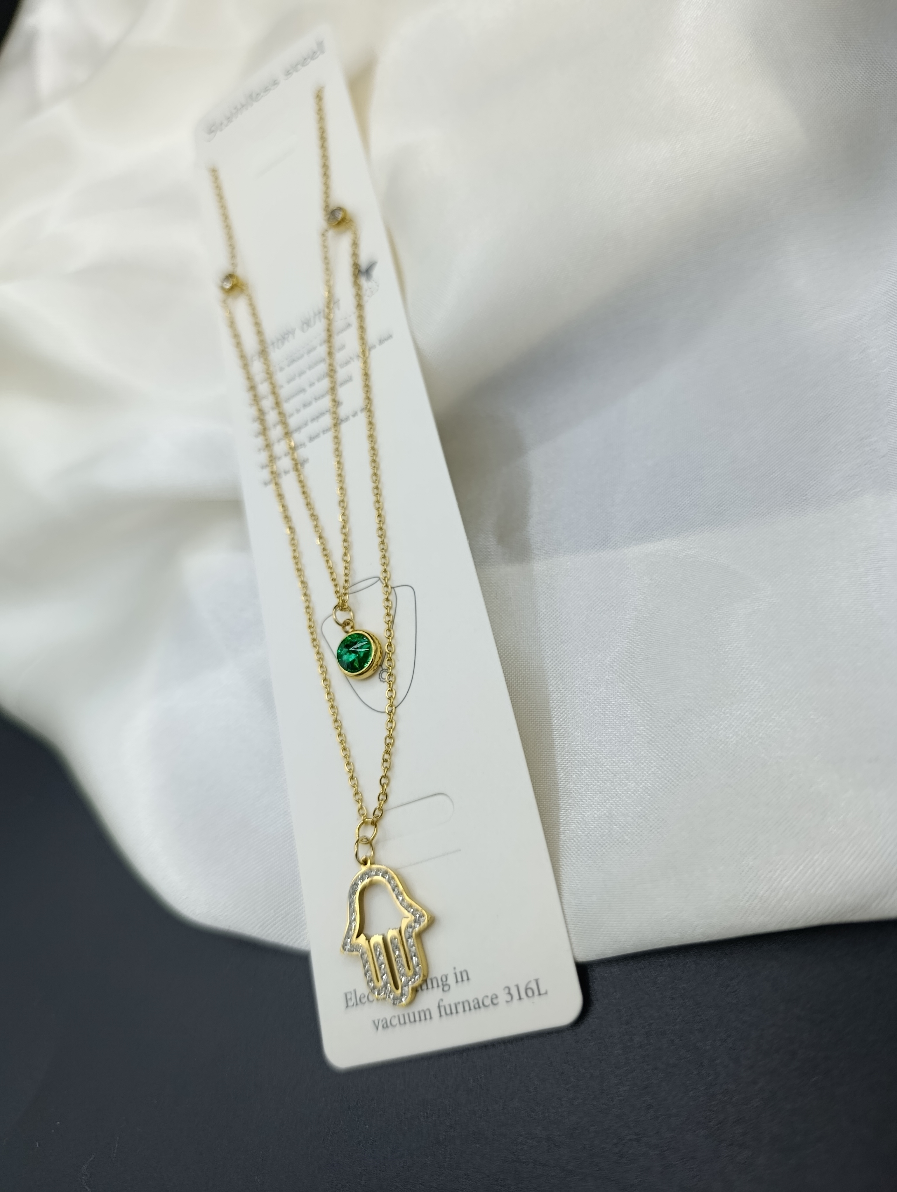 Yeşil Kristalli Zirkon Taşlı Fatma Ana Eli Çelik Kolye