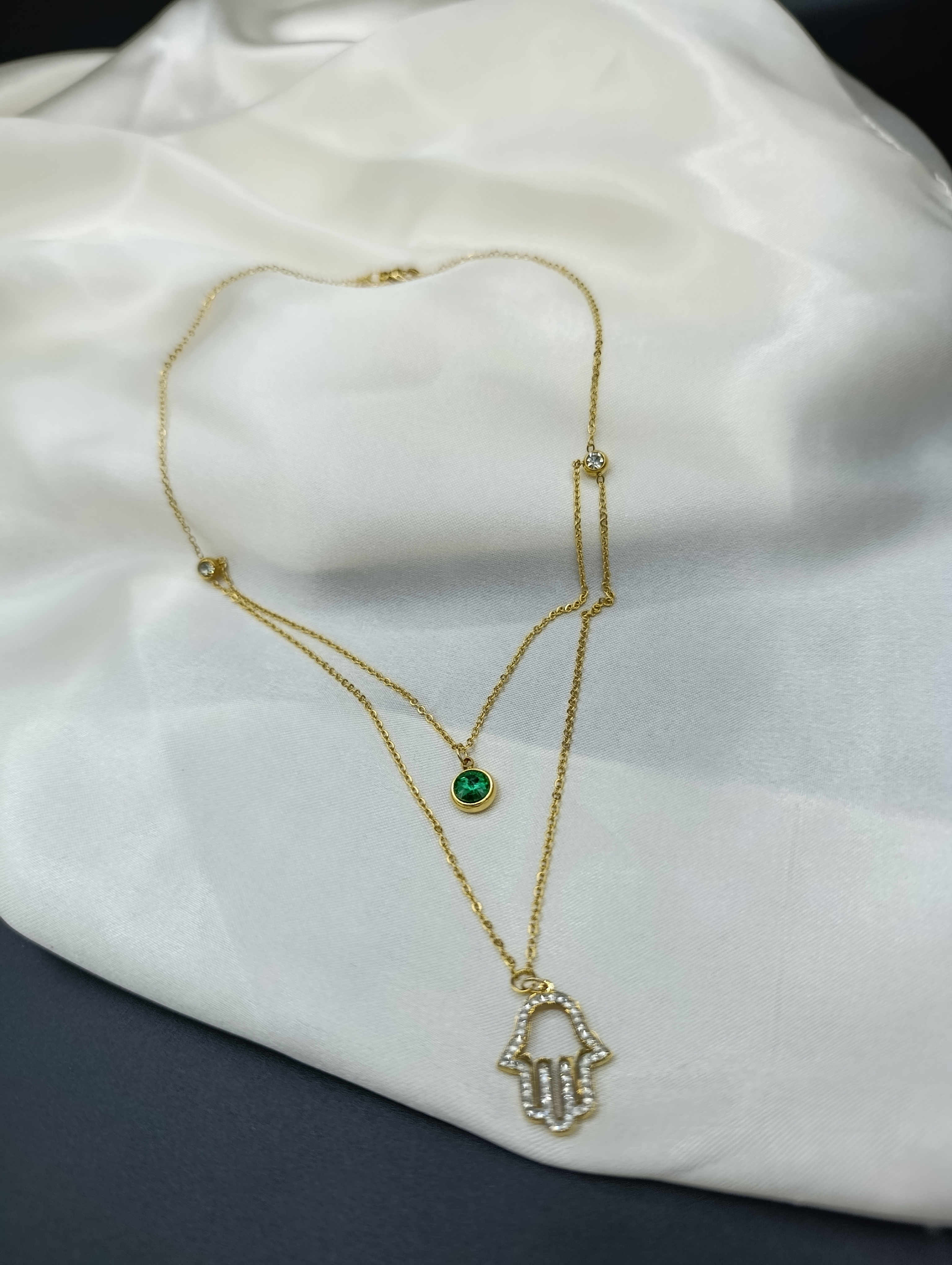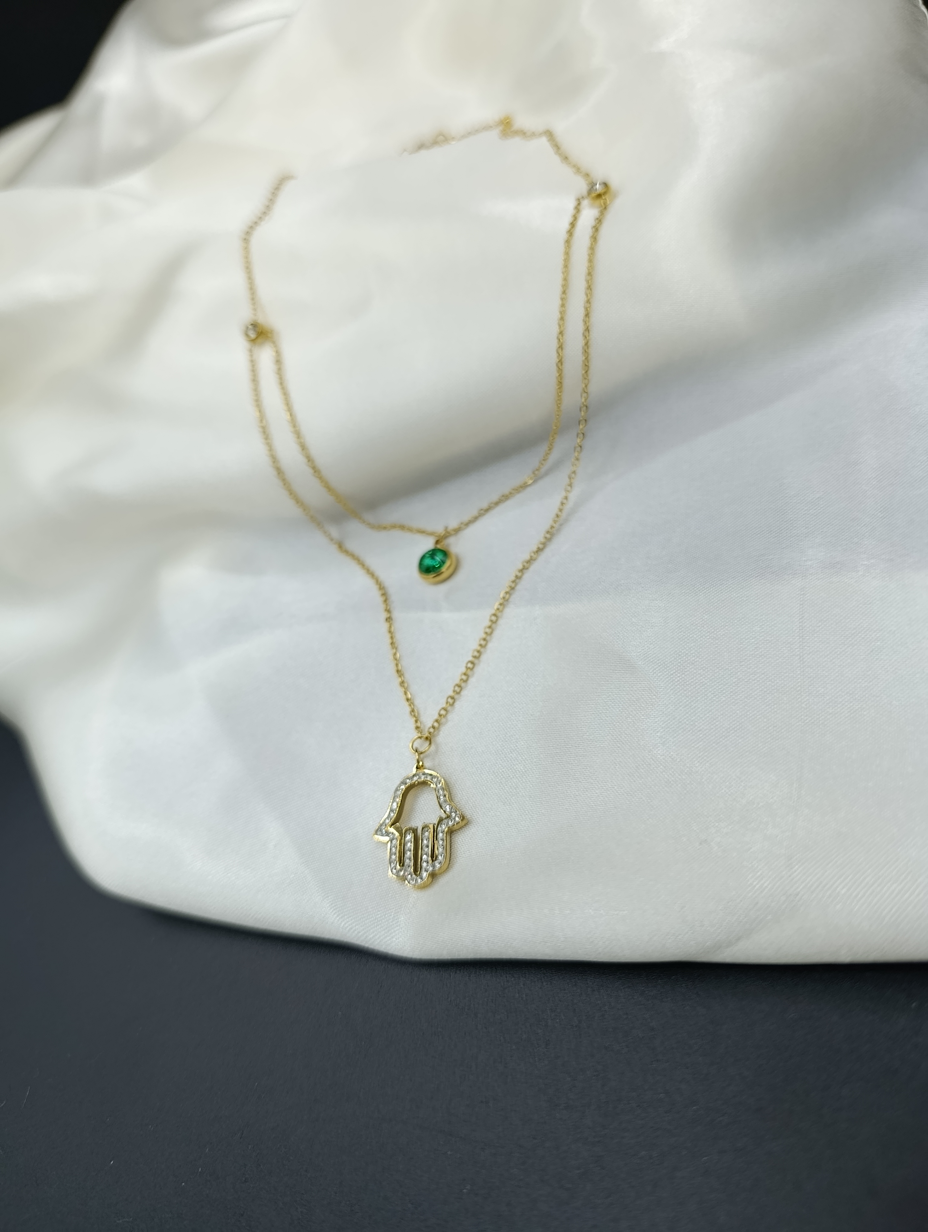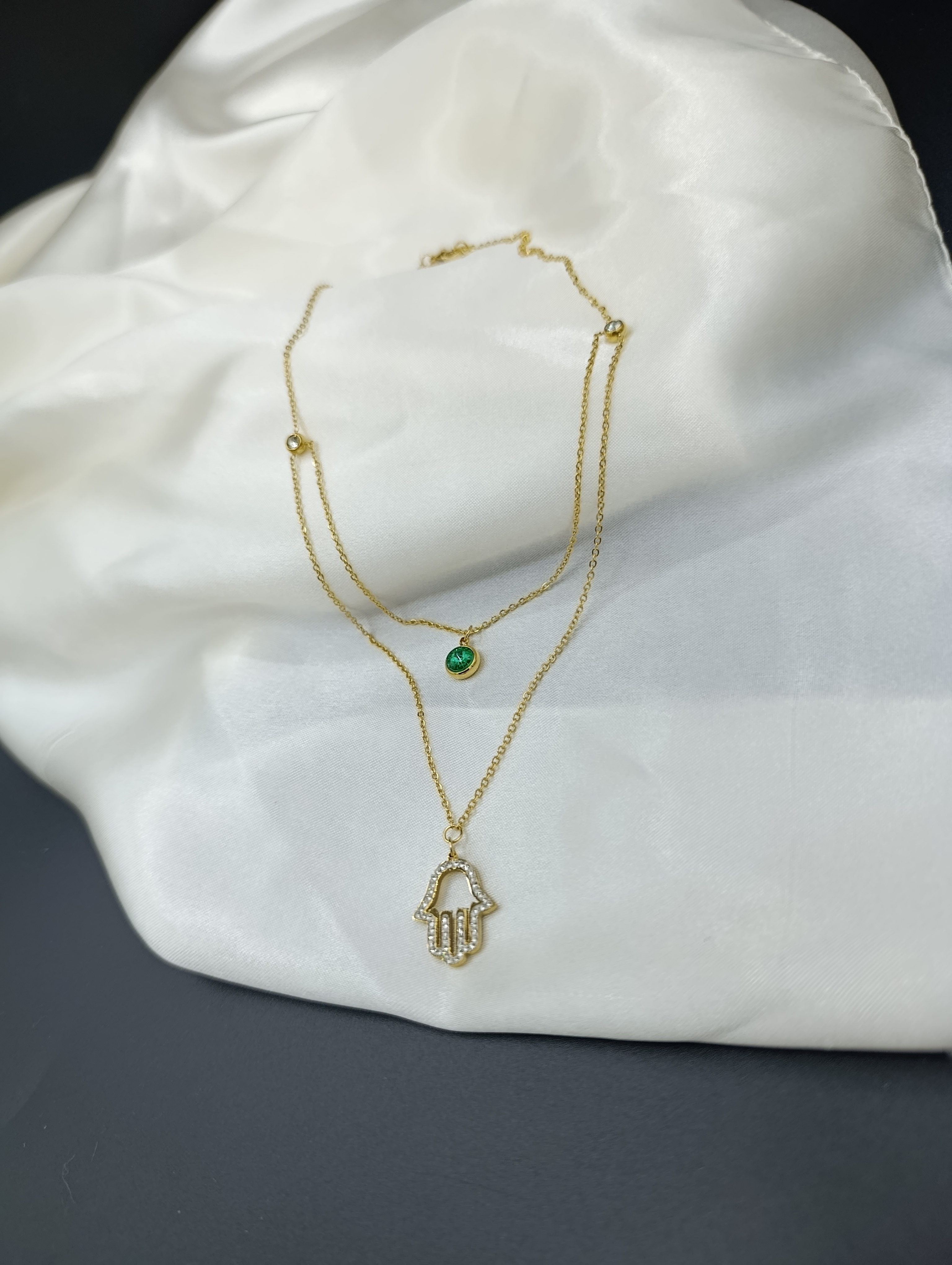 Yeşil Kristalli Zirkon Taşlı Fatma Ana Eli Çelik Kolye