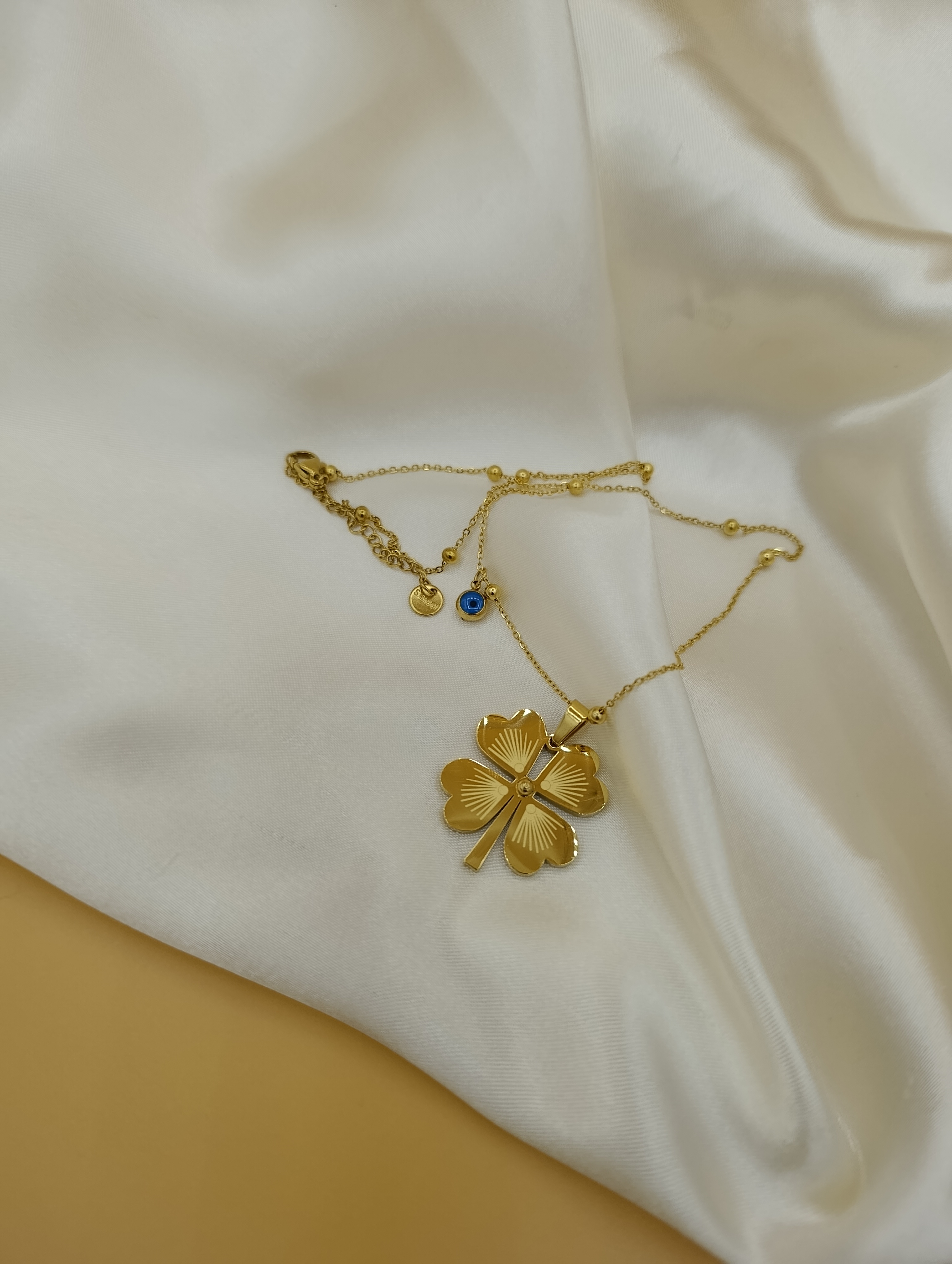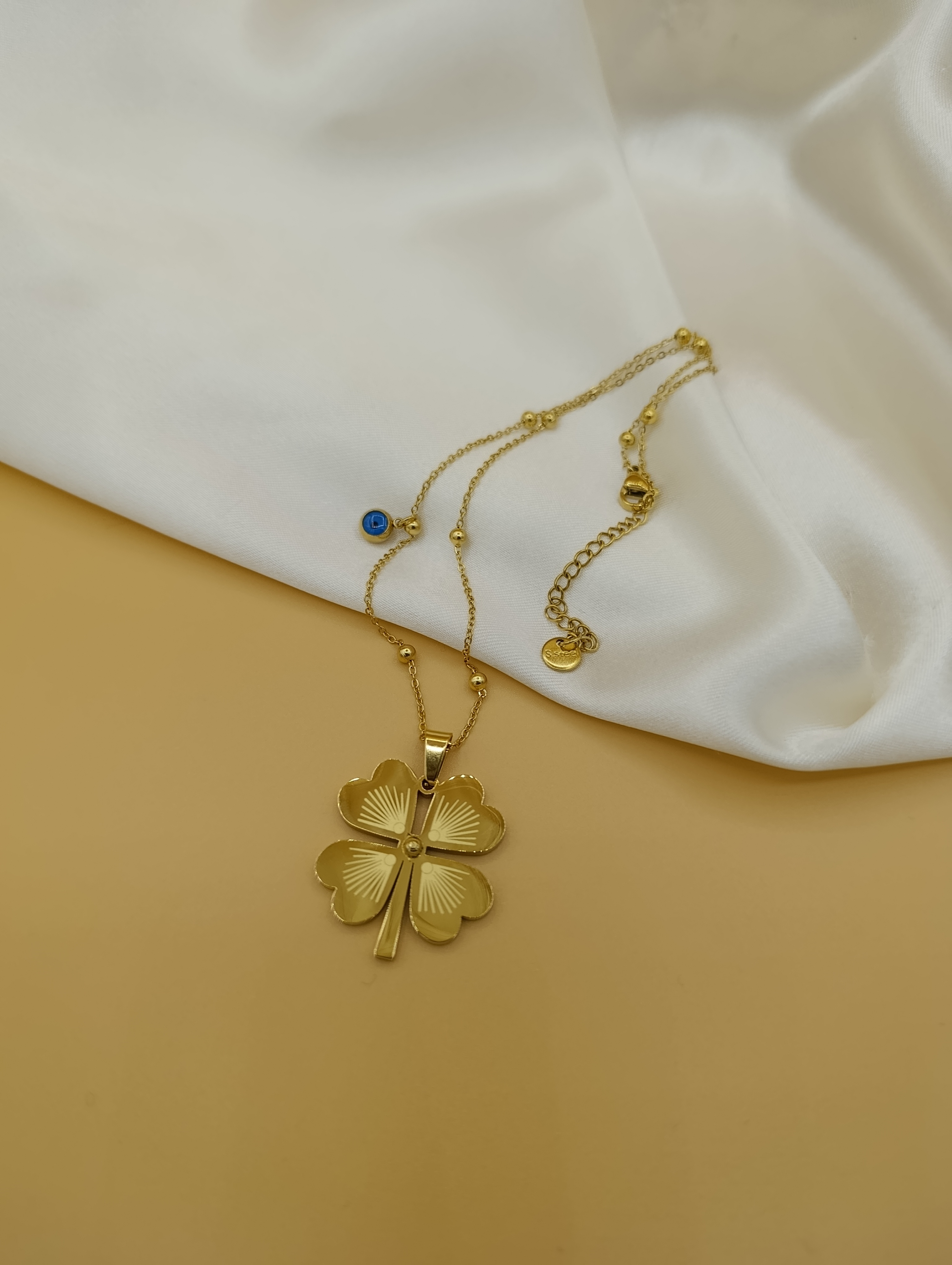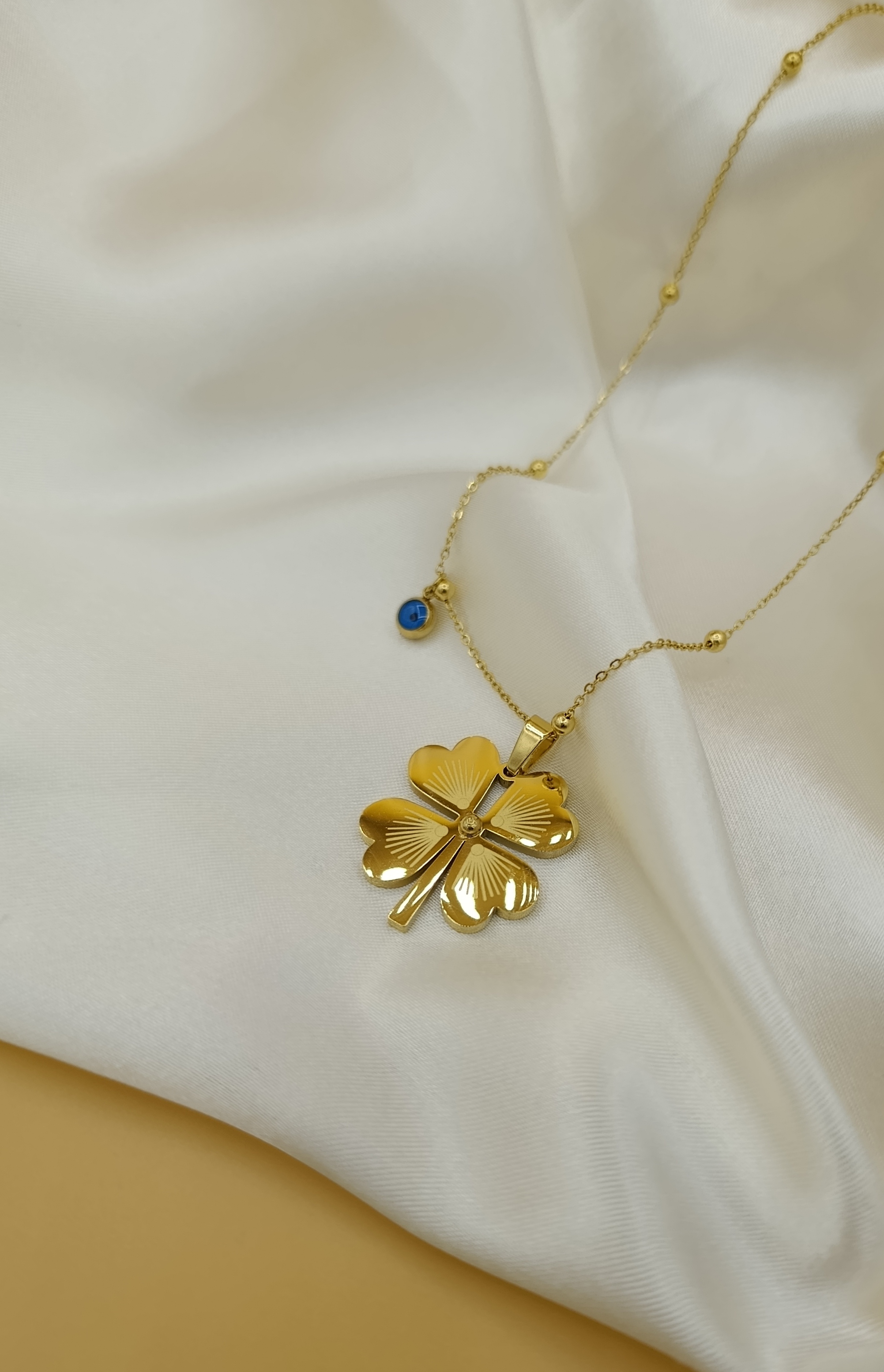 Yonca Firgürlü Mavi Boncuklu Çelik Dorika Zincir Kolye