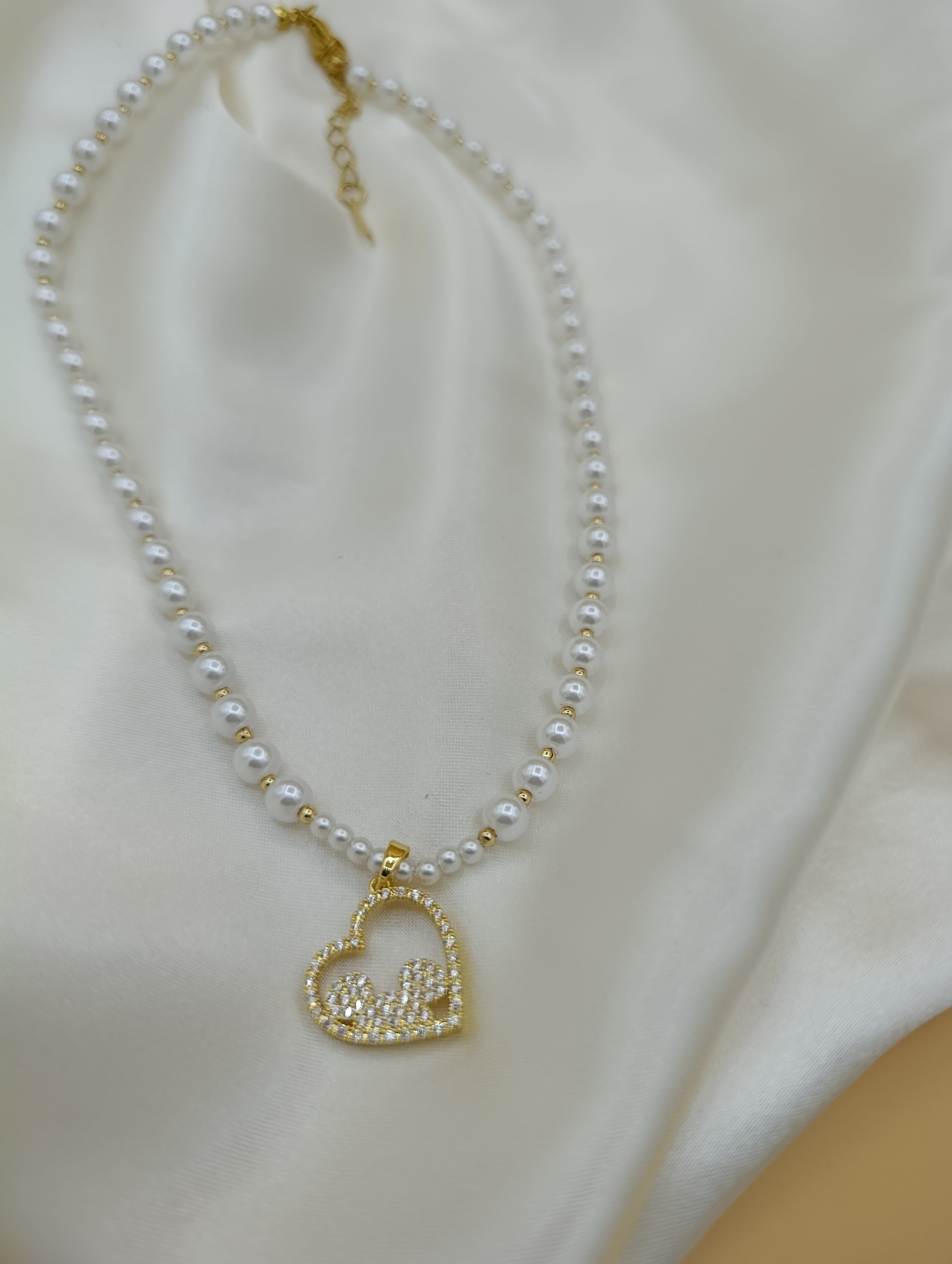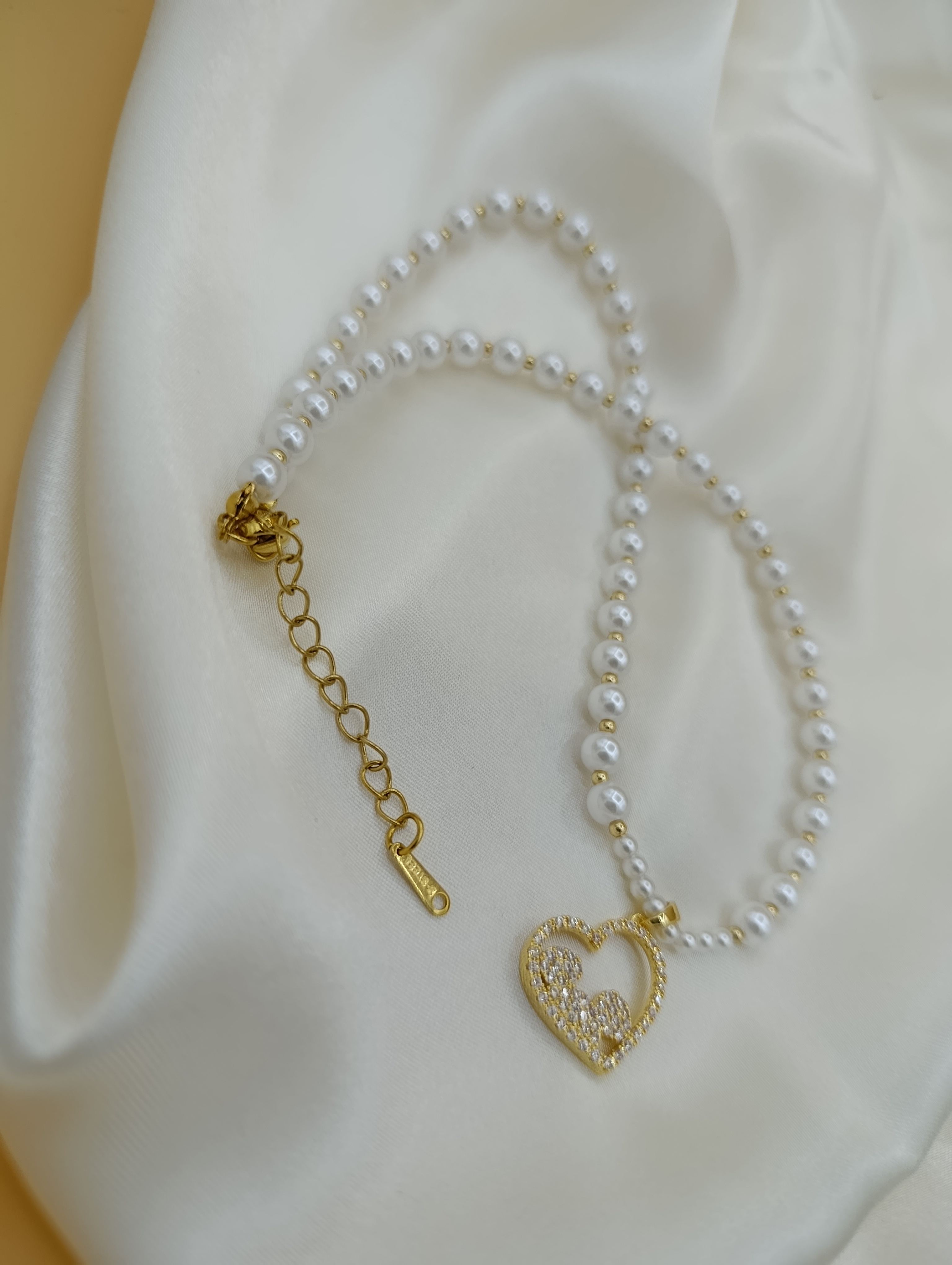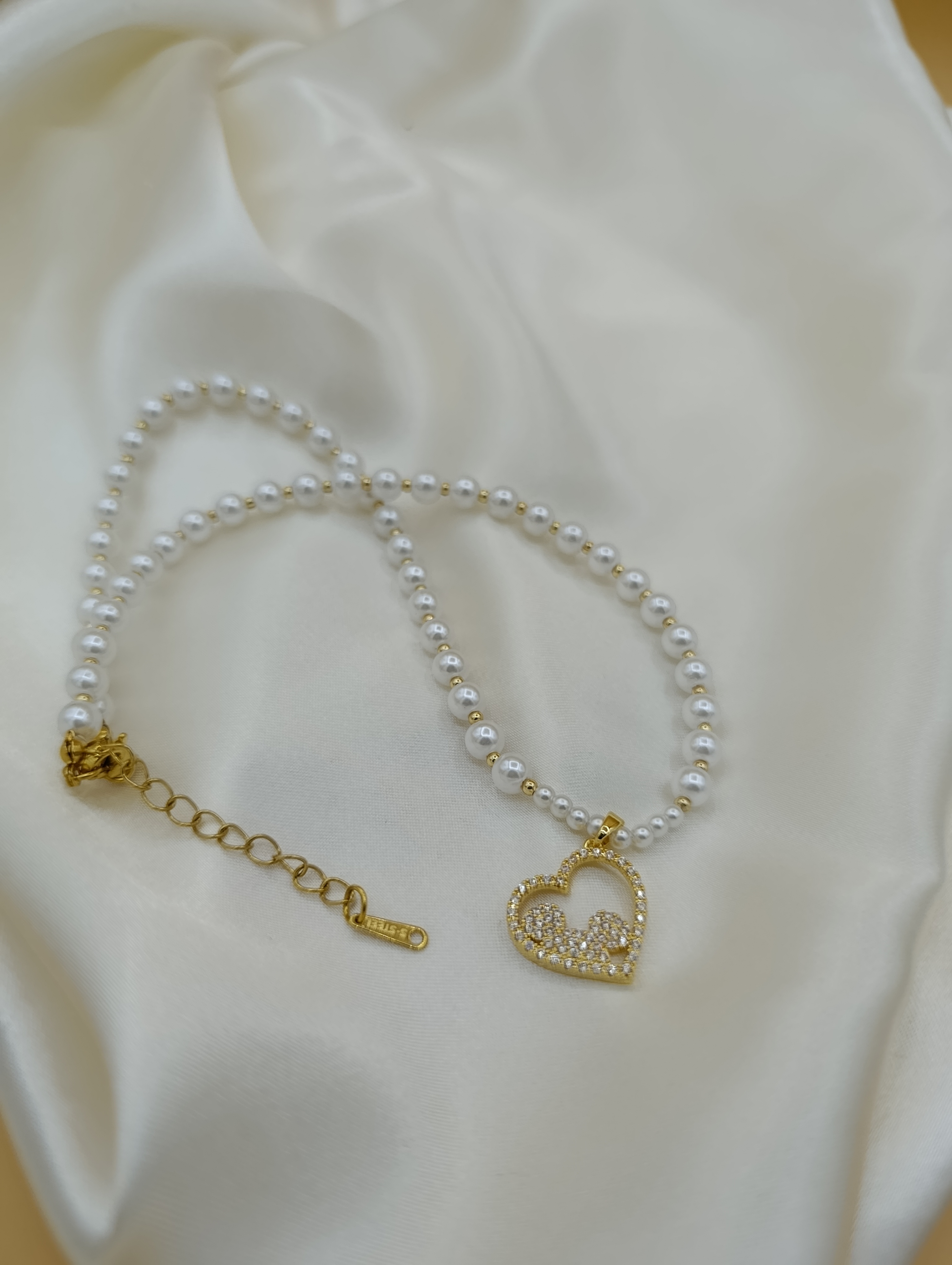 Zirkon Taşlı Kalp Figürlü İncili Çelik Kolye