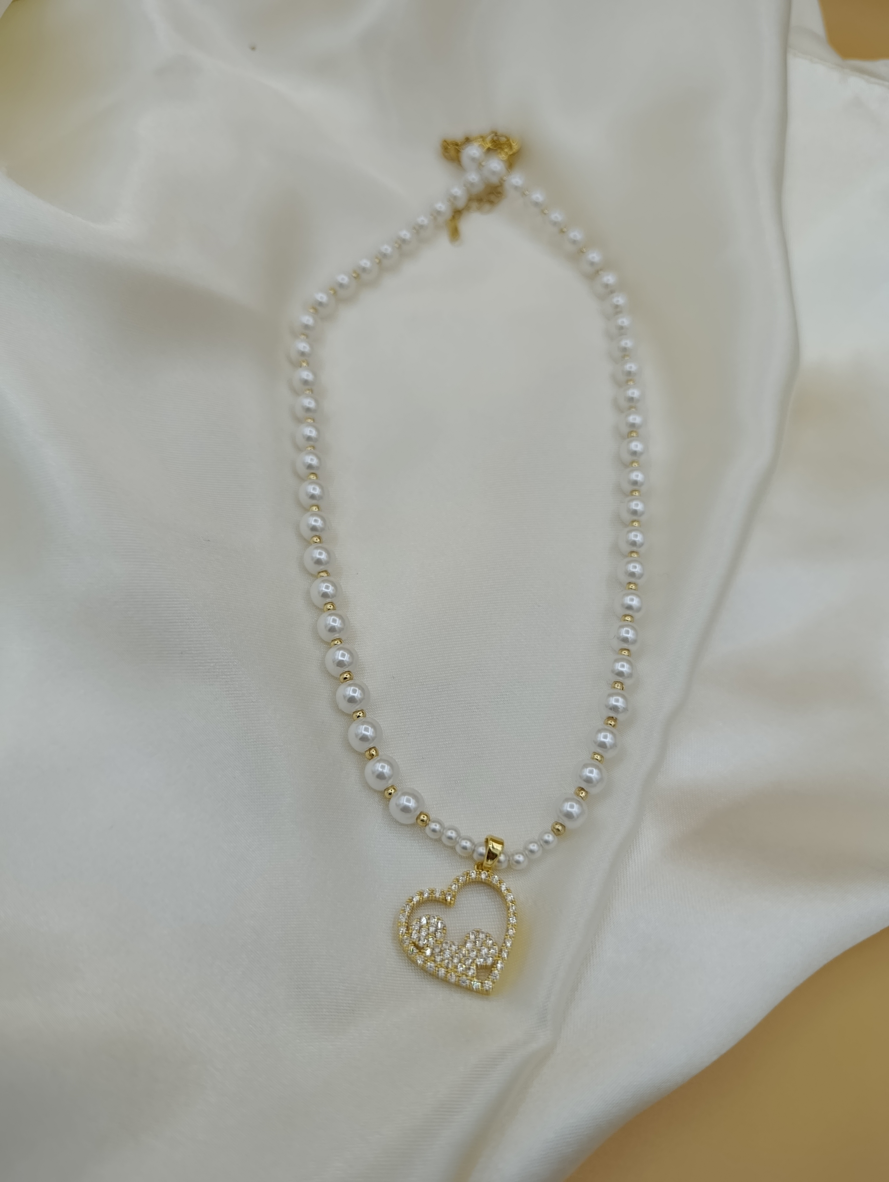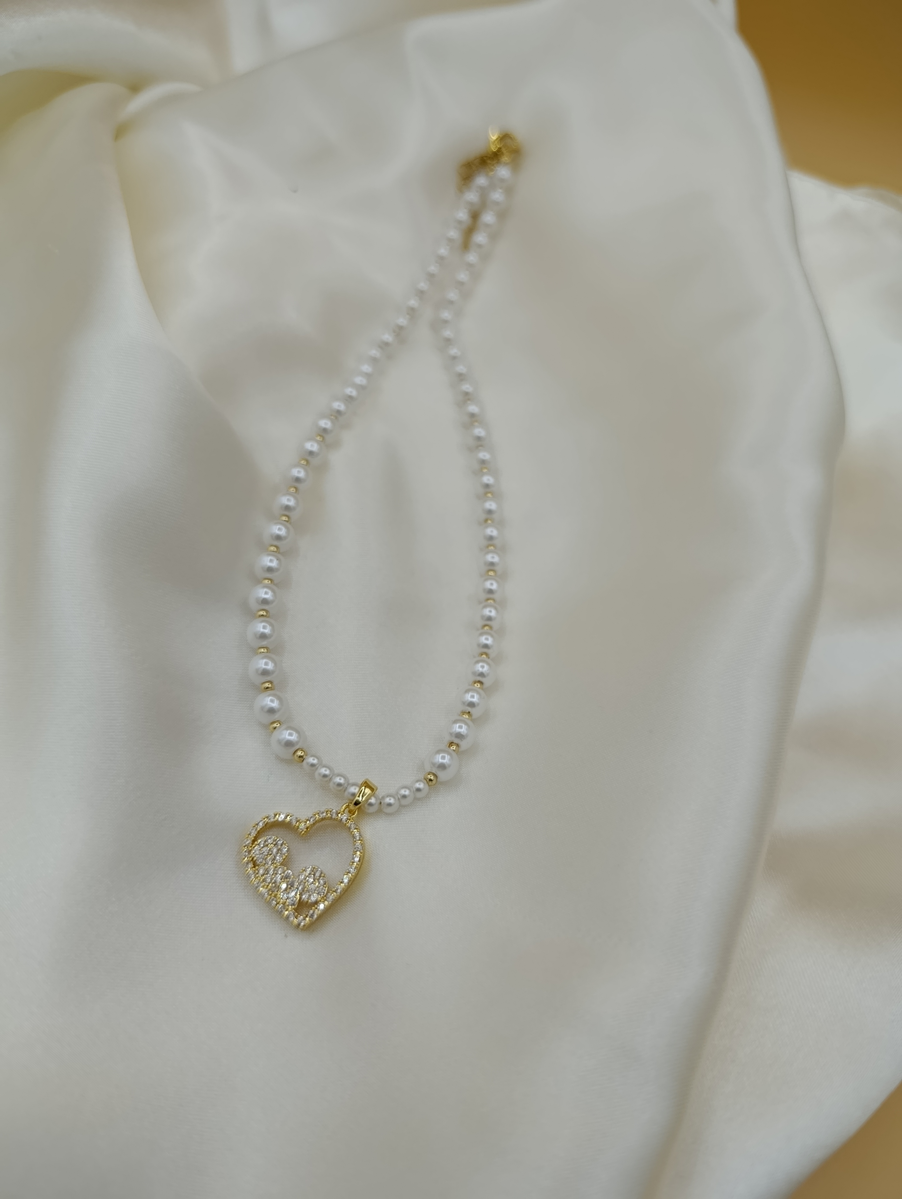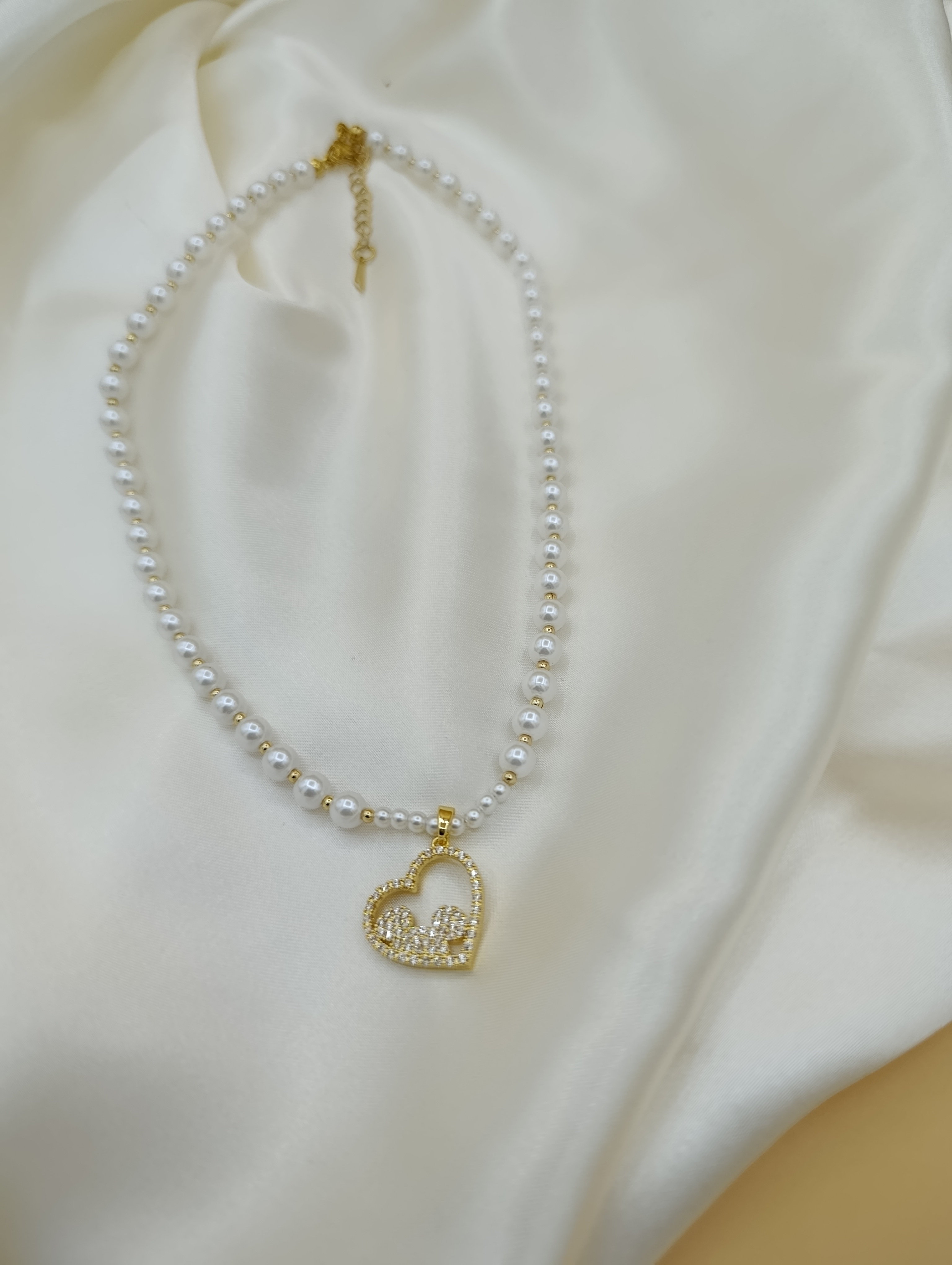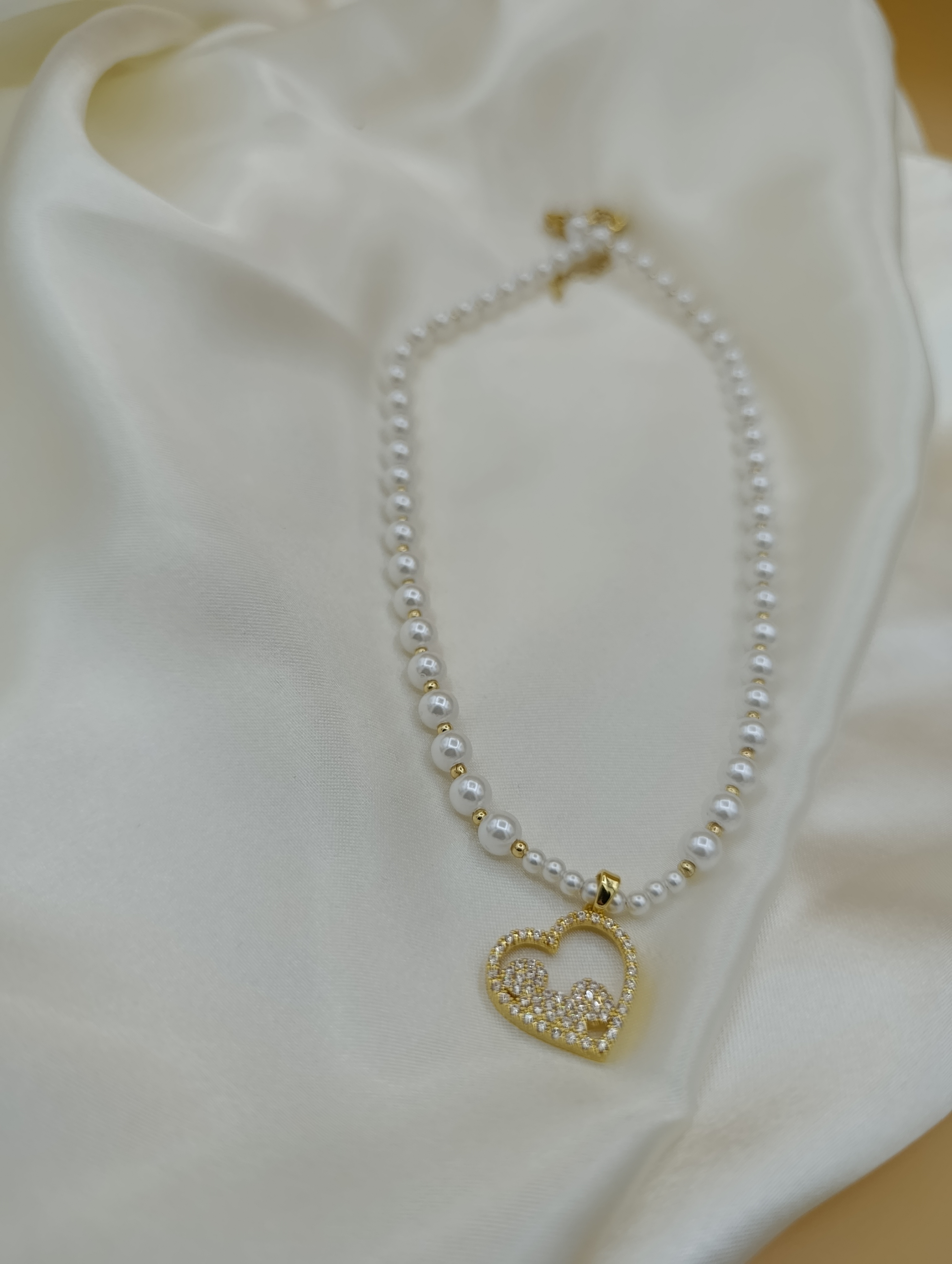Zirkon Taşlı Kalp Figürlü İncili Çelik Kolye